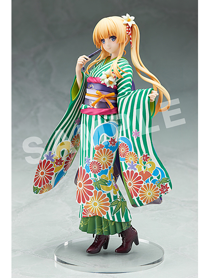 Enjoy the detailed craftsmanship re-creating the newly illustrated image of Eriri by Kurehito Misaki (Original Character Designer). From her flowing golden blonde hair, the vibrant green striped Kimono, and the lily ornaments decorating her twin-tails and belt…let this heroine clad in a modern Kimono be a part of your collection today!